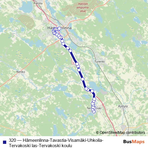The first stop of the 320 bus route is Tervakosken koulu and the last stop is Hämeenlinna linja-autoasema, tulolaituri. 320 (Hämeenlinna-Tavastia-Visamäki-Uhkoila-Tervakoski las-Tervakoski koulu) is operational during on weekdays.
