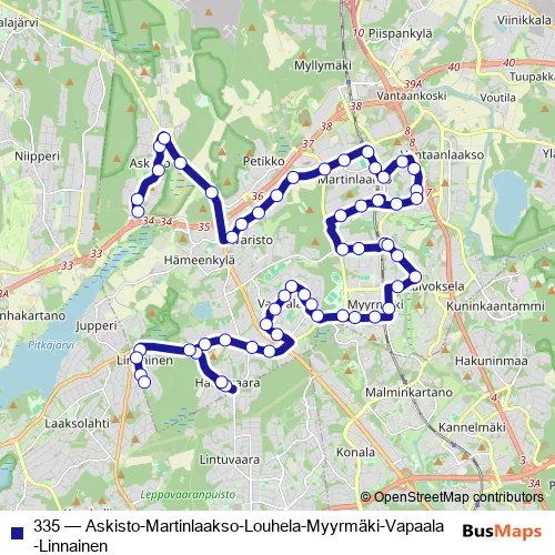 The first stop of the 335 bus route is Uudenkyläntie and the last stop is Aisakellontie. 335 (Askisto-Martinlaakso-Louhela-Myyrmäki-Vapaala-Linnainen) is operational during on weekdays.