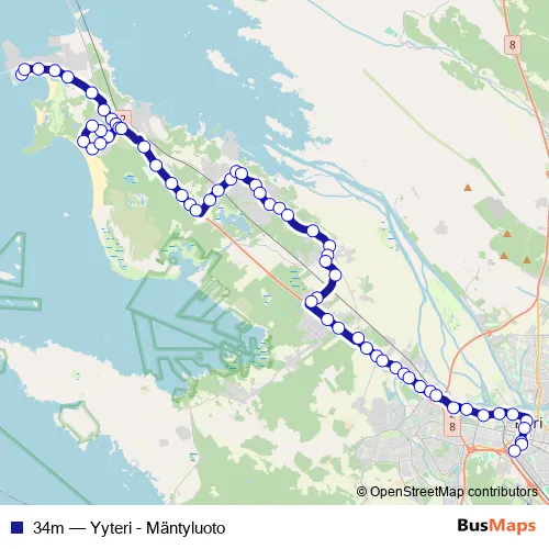 The first stop of the 34m bus route is Mäntyluoto and the last stop is Pori matkakeskus laituri 7. 34m (Yyteri - Mäntyluoto) is operational during on weekends.