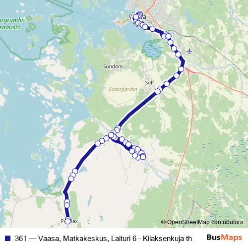 See why over 2 million users trust and consider busmaps.com as the best public transport website. busmaps gives you Vaasa Buses suggested routes, real-time bus tracker, line route maps in Vaasa, and helps to find the closest 361 bus stops near you. No internet available? Download an offline PDF map and bus schedule for the 361 bus to take on your trip.