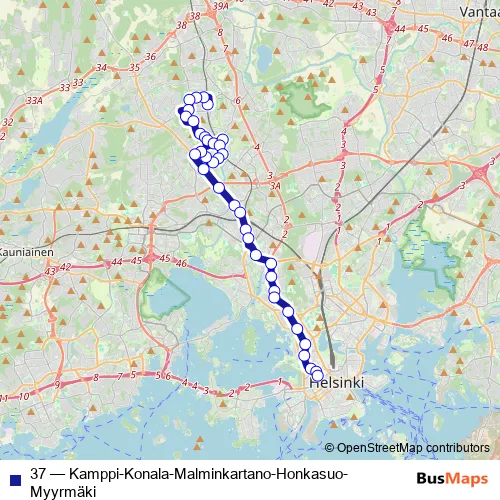 See why over 2 million users trust and consider busmaps.com as the best public transport website. busmaps gives you Helsinki Buses suggested routes, real-time bus tracker, line route maps in Helsinki, and helps to find the closest 37 bus stops near you. No internet available? Download an offline PDF map and bus schedule for the 37 bus to take on your trip.