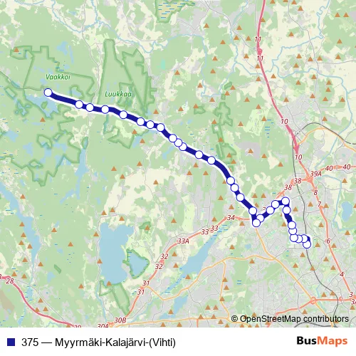 The first stop of the 375 bus route is Myyrmäen asema and the last stop is Saarijärvi. 375 (Myyrmäki-Kalajärvi-(Vihti)) is operational during everyday.