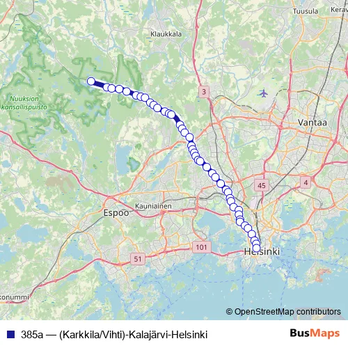See why over 2 million users trust and consider busmaps.com as the best public transport website. busmaps gives you Helsinki Buses suggested routes, real-time bus tracker, line route maps in Helsinki, and helps to find the closest 385a bus stops near you. No internet available? Download an offline PDF map and bus schedule for the 385a bus to take on your trip.