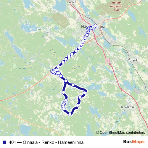 The first stop of the 401 bus route is Rengon Teboil (kääntöpaikka) and the last stop is Terveyskeskus I. 401 (Oinaala - Renko - Hämeenlinna) is operational during on weekdays.