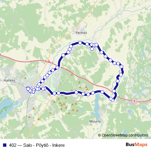 The first stop of the 402 bus route is Salo linja-autoasema and the last stop is Salo linja-autoasema Mariankatu. 402 (Salo - Pöytiö - Inkere) is operational during on weekdays.
