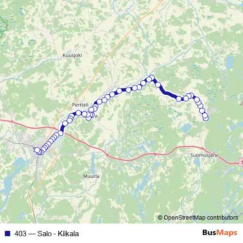 The first stop of the 403 bus route is Oinasjärvi I and the last stop is Salo linja-autoasema Mariankatu. 403 (Salo - Kiikala) is operational during on weekdays.