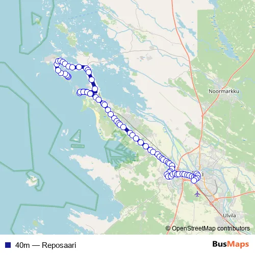 The first stop of the 40m bus route is Reposaari and the last stop is Pori matkakeskus laituri 7. 40m (Reposaari) is operational during on weekdays.