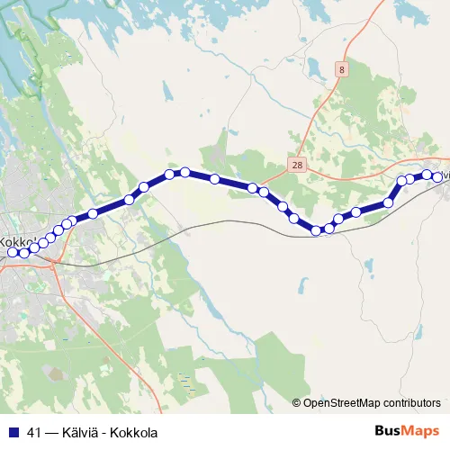 The first stop of the 41 bus route is Kälviä L and the last stop is linja-autoasema. 41 (Kälviä - Kokkola) is operational during on weekdays.