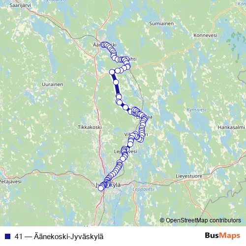 The first stop of the 41 bus route is Äänekoski and the last stop is Keskussairaala 2. 41 (Äänekoski-Jyväskylä) is operational during everyday.