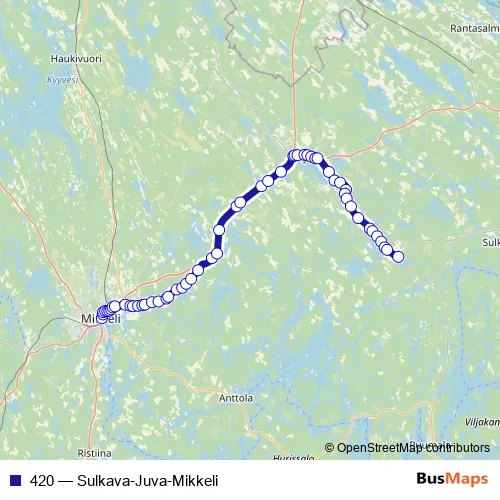 The first stop of the 420 bus route is Mikkeli laituri 1 and the last stop is Kaskii I. 420 (Sulkava-Juva-Mikkeli) is operational during on weekdays.