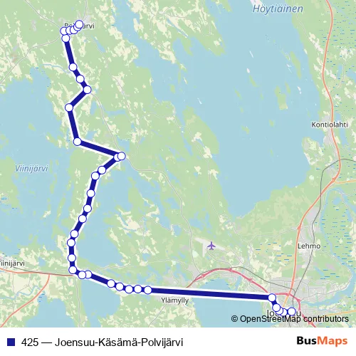 The first stop of the 425 bus route is Joensuun linja-autoasema, 4 and the last stop is Polvijärvi las. 425 (Joensuu-Käsämä-Polvijärvi) is operational during on weekdays.