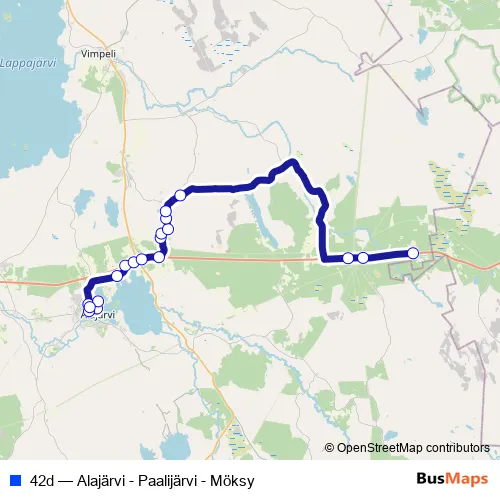 The first stop of the 42d bus route is Alajärvi Abc and the last stop is Möksy I. 42d (Alajärvi - Paalijärvi - Möksy) is operational during on weekdays.