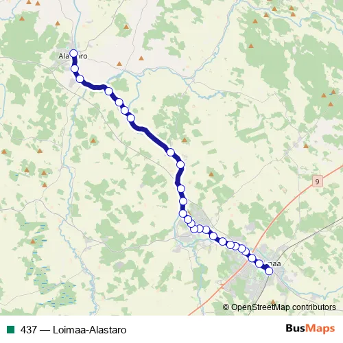 The first stop of the 437 bus route is Loimaan linja-autoasema and the last stop is Alastaro keskusta. 437 (Loimaa-Alastaro) is operational during on weekdays.