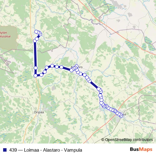 The first stop of the 439 bus route is Rautatieasema and the last stop is Vampula kirjasto P. 439 (Loimaa - Alastaro - Vampula) is operational during on weekdays.