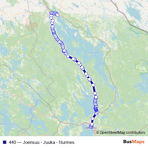 The first stop of the 440 bus route is 5 and the last stop is linja-autoasema. 440 (Joensuu - Juuka - Nurmes) is operational during everyday.
