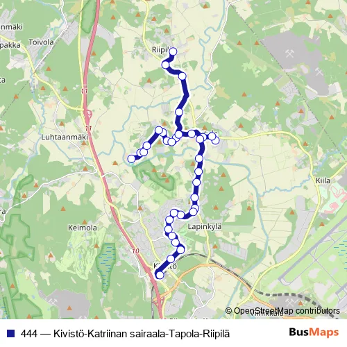 The first stop of the 444 bus route is Riipilä and the last stop is Kivistön asema. 444 (Kivistö-Katriinan sairaala-Tapola-Riipilä) is operational during on weekdays.
