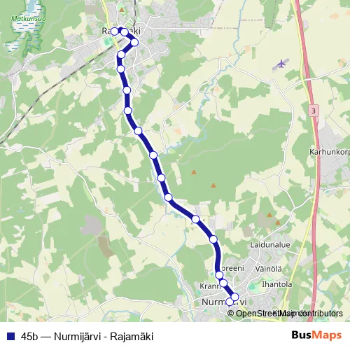 The first stop of the 45b bus route is linja-autoasema and the last stop is 3. 45b (Nurmijärvi - Rajamäki) is operational during on weekdays.