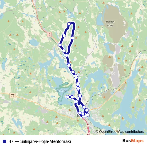 The first stop of the 47 bus route is Siilinjärvi and the last stop is Siilinjärvi saapuvat. 47 (Siilinjärvi-Pöljä-Mehtomäki) is operational during on weekdays.