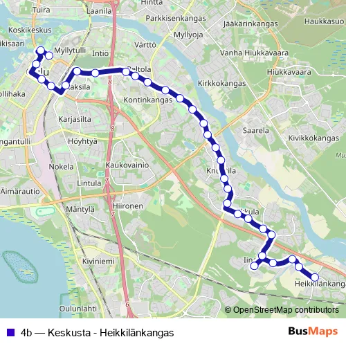 See why over 2 million users trust and consider busmaps.com as the best public transport website. busmaps gives you Oulu Buses suggested routes, real-time bus tracker, line route maps in Oulu, and helps to find the closest 4b bus stops near you. No internet available? Download an offline PDF map and bus schedule for the 4b bus to take on your trip.