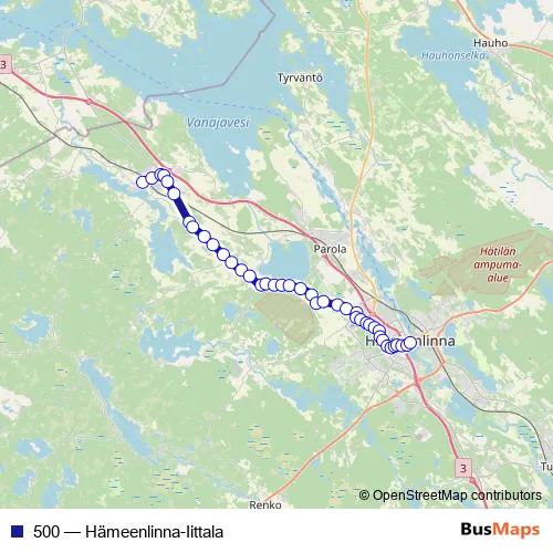 The first stop of the 500 bus route is Iittala, linja-autoasema and the last stop is Hämeenlinna linja-autoasema, tulolaituri. 500 (Hämeenlinna-Iittala) is operational during on weekdays.