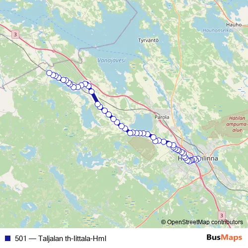The first stop of the 501 bus route is Hämeenlinna linja-autoasema, laituri 5 and the last stop is Taljalan th L. 501 (Taljalan th-Iittala-Hml) is operational during on weekdays.