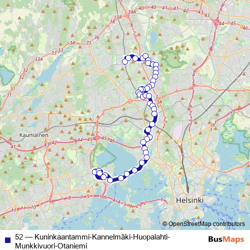 See why over 2 million users trust and consider busmaps.com as the best public transport website. busmaps gives you Helsinki Buses suggested routes, real-time bus tracker, line route maps in Helsinki, and helps to find the closest 52 bus stops near you. No internet available? Download an offline PDF map and bus schedule for the 52 bus to take on your trip.