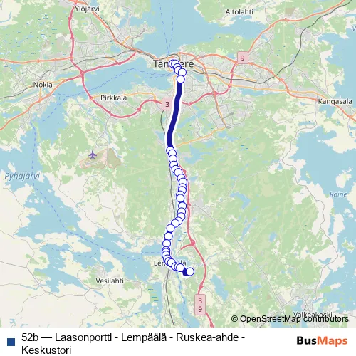 The first stop of the 52b bus route is Keskustori H and the last stop is Laasonportti. 52b (Laasonportti - Lempäälä - Ruskea-ahde - Keskustori) is operational during on weekdays.