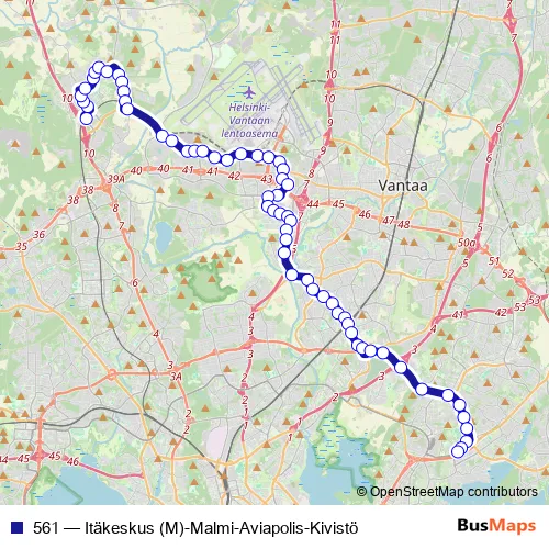 The first stop of the 561 bus route is Kivistön asema and the last stop is Itäkeskus (M). 561 (Itäkeskus (M)-Malmi-Aviapolis-Kivistö) is operational during everyday.