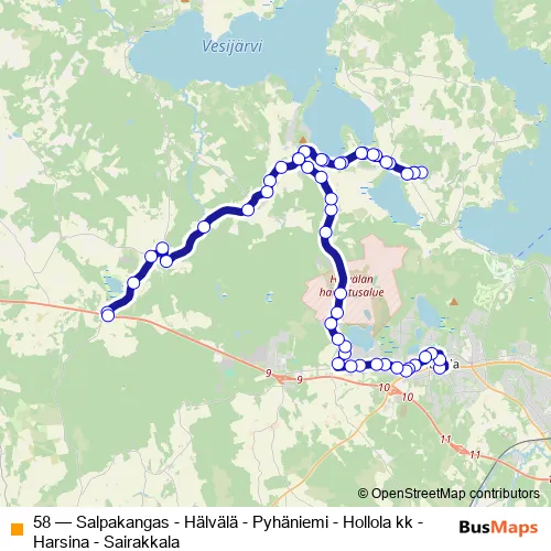 The first stop of the 58 bus route is Salpakankaan koulu and the last stop is Sairakkala. 58 (Salpakangas - Hälvälä - Pyhäniemi - Hollola kk - Harsina - Sairakkala) is operational during on weekdays.
