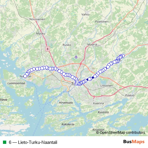 The first stop of the 6 bus route is Nuolemo and the last stop is Naantali. 6 (Lieto-Turku-Naantali) is operational during everyday.