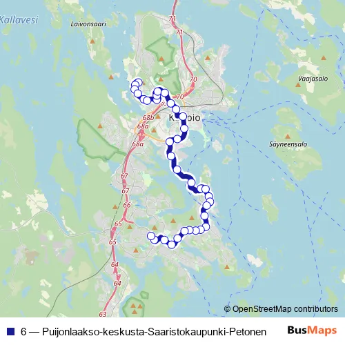 The first stop of the 6 bus route is Samoilijantie and the last stop is Pyöröntori L. 6 (Puijonlaakso-keskusta-Saaristokaupunki-Petonen) is operational during everyday.