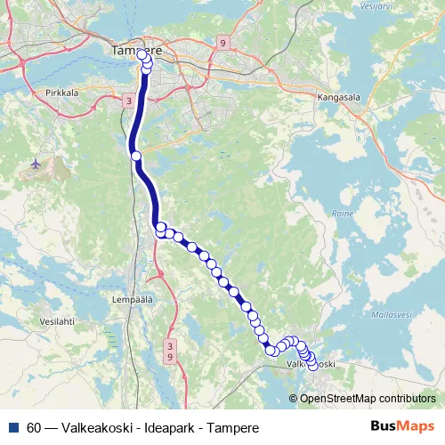 The first stop of the 60 bus route is Valkeakosken linja-autoasema and the last stop is Sorin aukio G. 60 (Valkeakoski - Ideapark - Tampere) is operational during everyday.