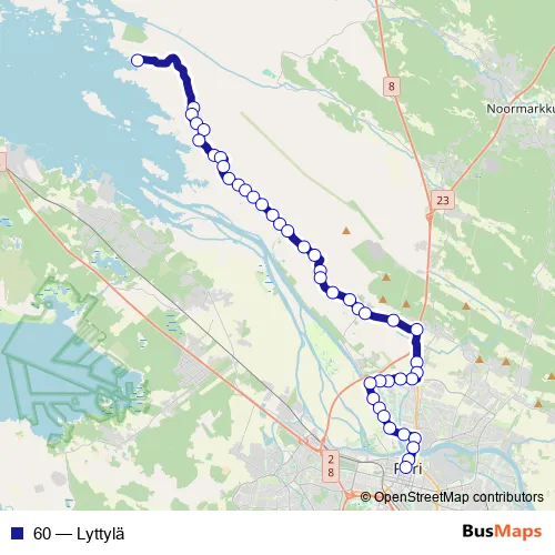 The first stop of the 60 bus route is Lyttylä and the last stop is Pori, Kauppatori. 60 (Lyttylä) is operational during on weekdays.