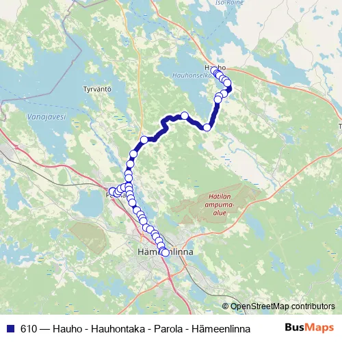 The first stop of the 610 bus route is Hauho linja-autoasema and the last stop is Hämeenlinna linja-autoasema, tulolaituri. 610 (Hauho - Hauhontaka - Parola - Hämeenlinna) is operational during on weekdays.