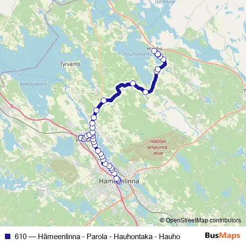 The first stop of the 610 bus route is Hämeenlinna linja-autoasema, laituri 4 and the last stop is Hauho linja-autoasema. 610 (Hämeenlinna - Parola - Hauhontaka - Hauho) is operational during on weekdays.