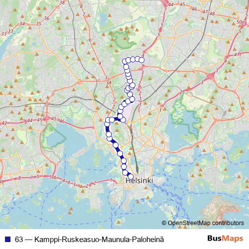 See why over 2 million users trust and consider busmaps.com as the best public transport website. busmaps gives you Helsinki Buses suggested routes, real-time bus tracker, line route maps in Helsinki, and helps to find the closest 63 bus stops near you. No internet available? Download an offline PDF map and bus schedule for the 63 bus to take on your trip.