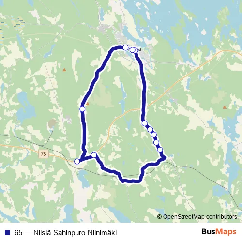 The first stop of the 65 bus route is Nilsiän koulukeskus and the last stop is Laitisenmäentie E. 65 (Nilsiä-Sahinpuro-Niinimäki) is operational during on weekdays.