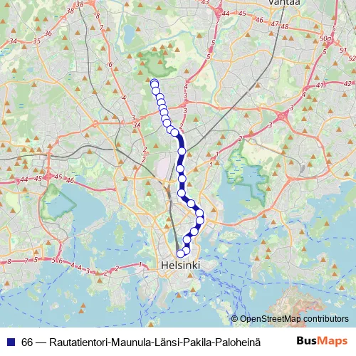 See why over 2 million users trust and consider busmaps.com as the best public transport website. busmaps gives you Helsinki Buses suggested routes, real-time bus tracker, line route maps in Helsinki, and helps to find the closest 66 bus stops near you. No internet available? Download an offline PDF map and bus schedule for the 66 bus to take on your trip.