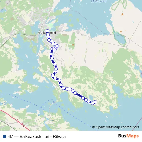 The first stop of the 67 bus route is Ritvala and the last stop is Valkeakosken kauppatori. 67 (Valkeakoski tori - Ritvala) is operational during on weekdays.