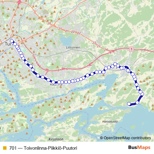 The first stop of the 701 bus route is Toivonlinna and the last stop is Puutori square Pt6. 701 (Toivonlinna-Piikkiö-Puutori) is operational during on weekdays.