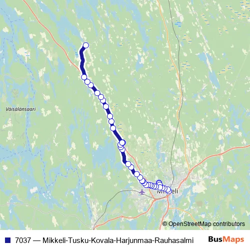 The first stop of the 7037 bus route is Mikkeli laituri 5 and the last stop is Pajulanti P. 7037 (Mikkeli-Tusku-Kovala-Harjunmaa-Rauhasalmi) is operational during on weekdays.