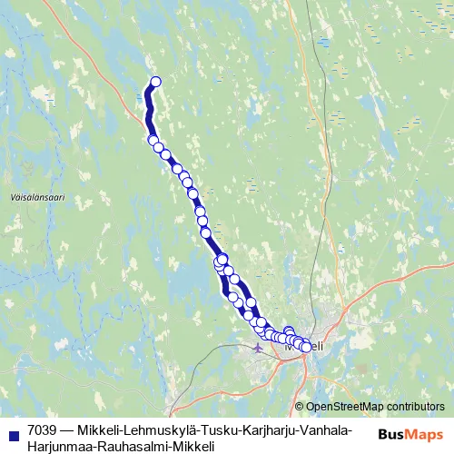 The first stop of the 7039 bus route is Mikkeli laituri 5 and the last stop is Mikkeli Matkakeskus, saapuvat. 7039 (Mikkeli-Lehmuskylä-Tusku-Karjharju-Vanhala-Harjunmaa-Rauhasalmi-Mikkeli) is operational during on weekdays.
