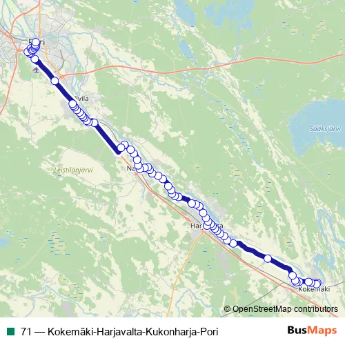 The first stop of the 71 bus route is Kokemäki, linja-autoasema and the last stop is Pori Kauppatori laituri 11. 71 (Kokemäki-Harjavalta-Kukonharja-Pori) is operational during on weekdays.