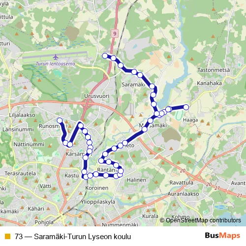 The first stop of the 73 bus route is Kiikku and the last stop is Saramäki. 73 (Saramäki-Turun Lyseon koulu) is operational during on weekdays.