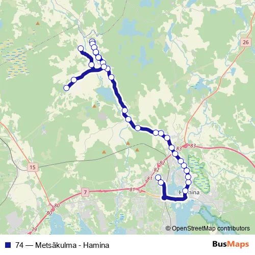 The first stop of the 74 bus route is Vehkalahden koulu (E) and the last stop is Metsäkulma, Sydänmaantie th E. 74 (Metsäkulma - Hamina) is operational during on weekdays.