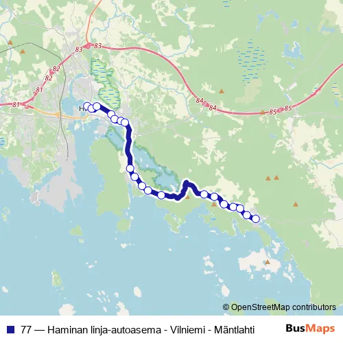 The first stop of the 77 bus route is Hamina linja-autoasema and the last stop is Mäntlahti Pyötsaaren risteys. 77 (Haminan linja-autoasema - Vilniemi - Mäntlahti) is operational during on weekdays.