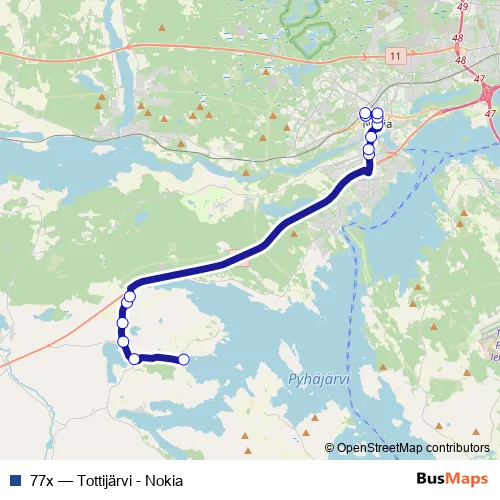 The first stop of the 77x bus route is Pajulahti and the last stop is Nokia A. 77x (Tottijärvi - Nokia) is operational during on weekdays.