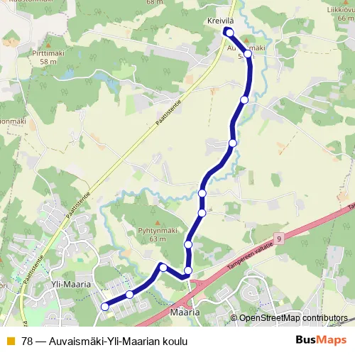 The first stop of the 78 bus route is Ypsilon and the last stop is Auvaismäki. 78 (Auvaismäki-Yli-Maarian koulu) is operational during on weekdays.