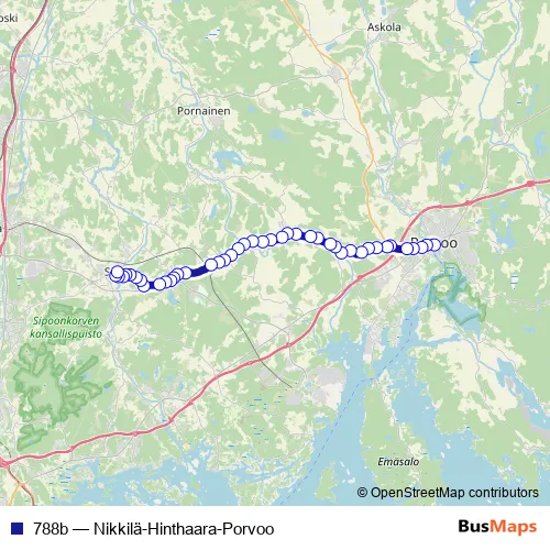 The first stop of the 788b bus route is Nikkilän terminaali and the last stop is Porvoo linja-autoas.. 788b (Nikkilä-Hinthaara-Porvoo) is operational during on weekends.