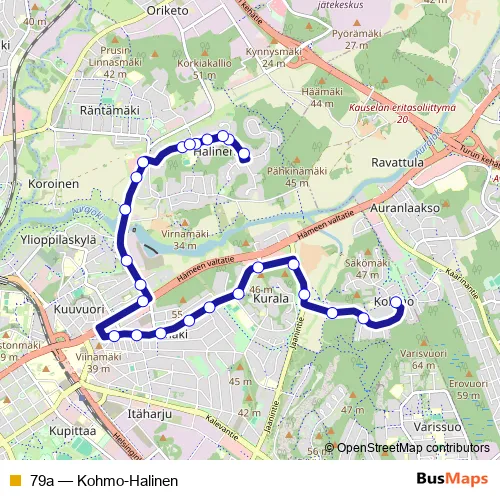The first stop of the 79a bus route is Halisten koulu L and the last stop is Kohmo. 79a (Kohmo-Halinen) is operational during on weekdays.